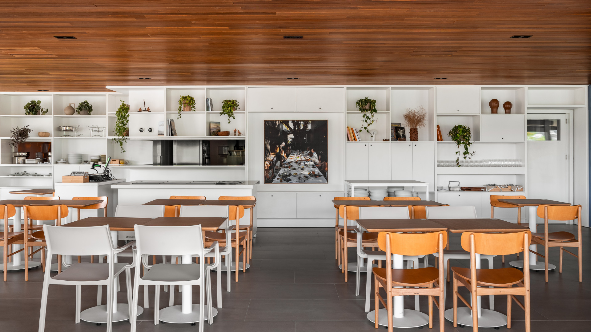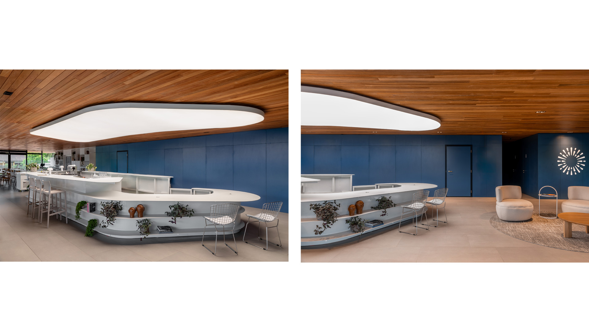 No caso do edifício do Showroom, o programa de necessidades bastante complexo incluía diversos usos com um ponto de intersecção em comum: promover uma experiência que simulasse a vida do futuro bairro. Implantamos a edificação no terreno, promovendo uma relação com o entorno por meio de muitas escadas externas, acessos e as áreas de jardim. Essa forte relação entre o exterior e o interior do edifício, acontece também de forma natural e integrada no espaço do restaurante e na jornada de experiência do usuário quando se visita o showroom.